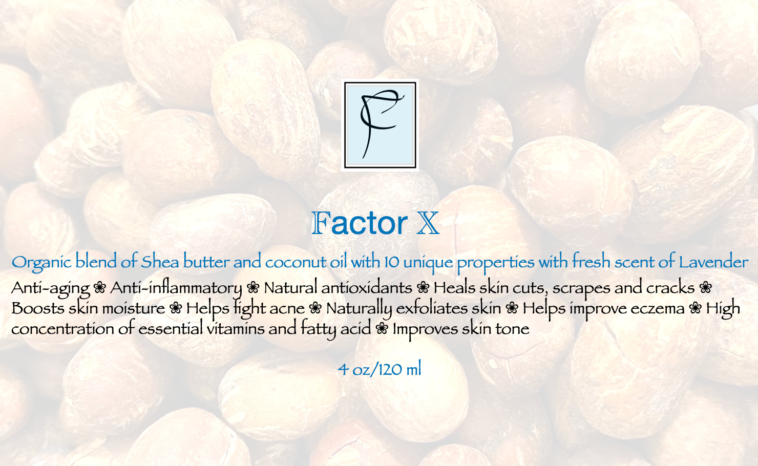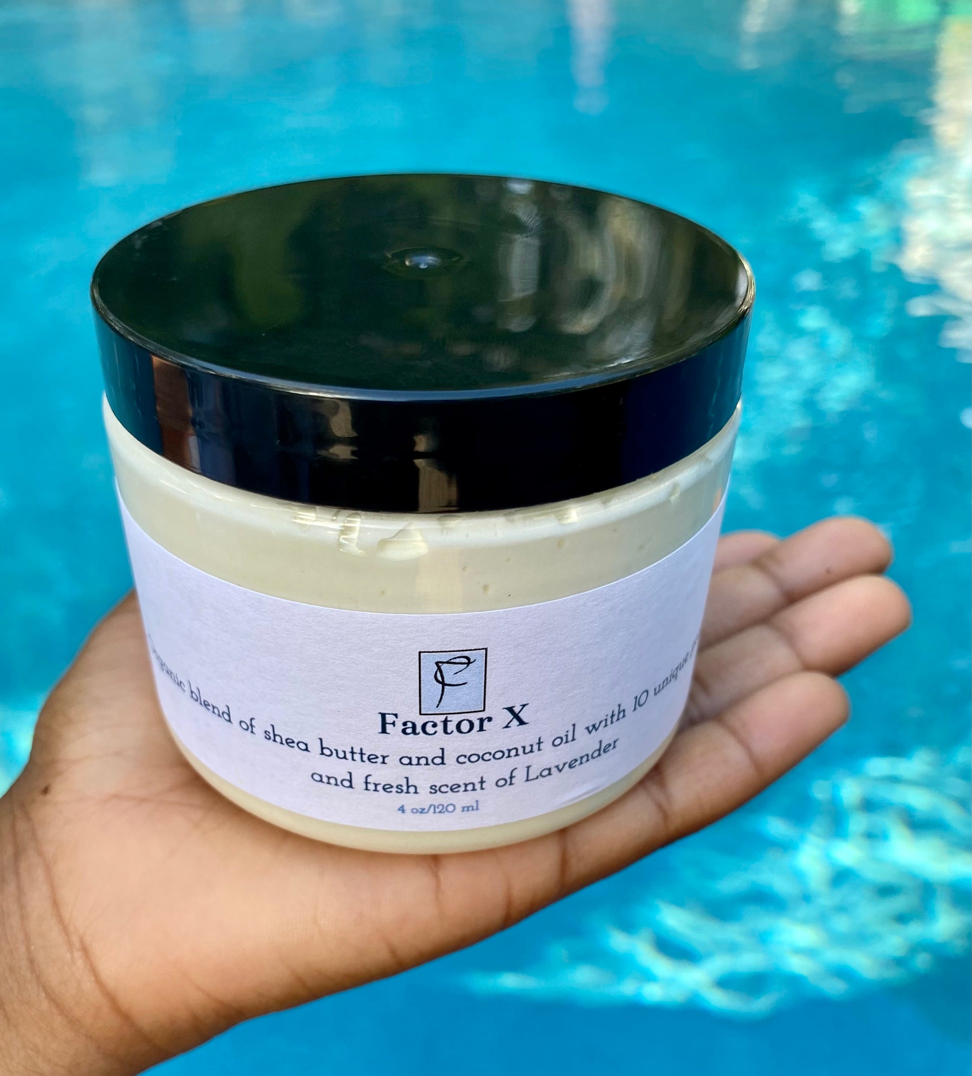 Factor X - Organic Skin moisturizer, blend of pure whipped shea butter with coconut oil and fresh aroma of LavenderOur products are made from clean ingredients, no hidden ingredients or materials!