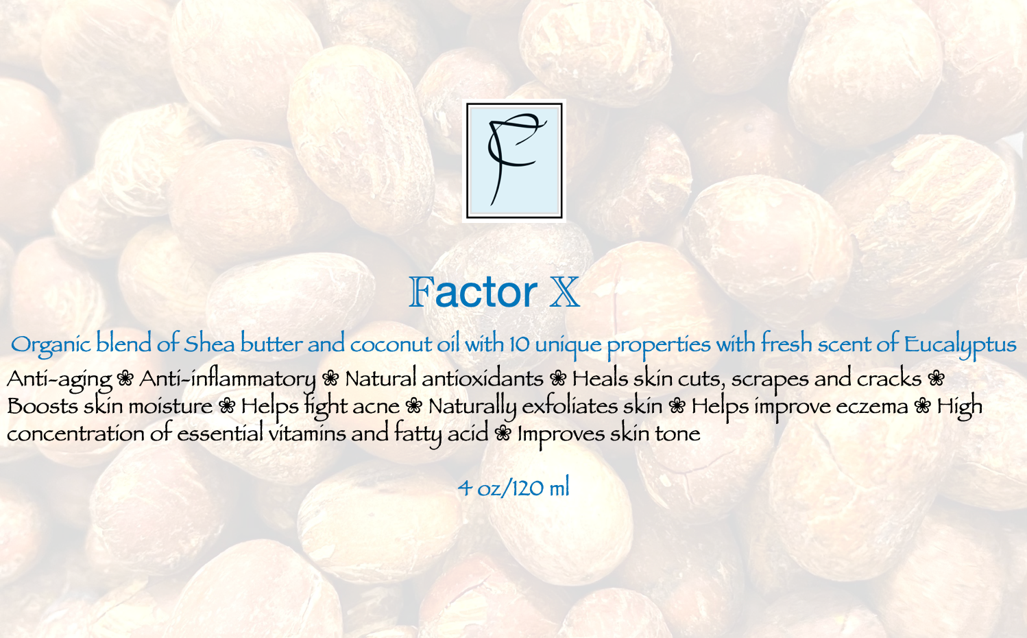 Factor X - Organic Skin moisturizer, blend of pure whipped shea butter with coconut oil (Unscented)Our products are made from clean ingredients, no hidden ingredients or materials!